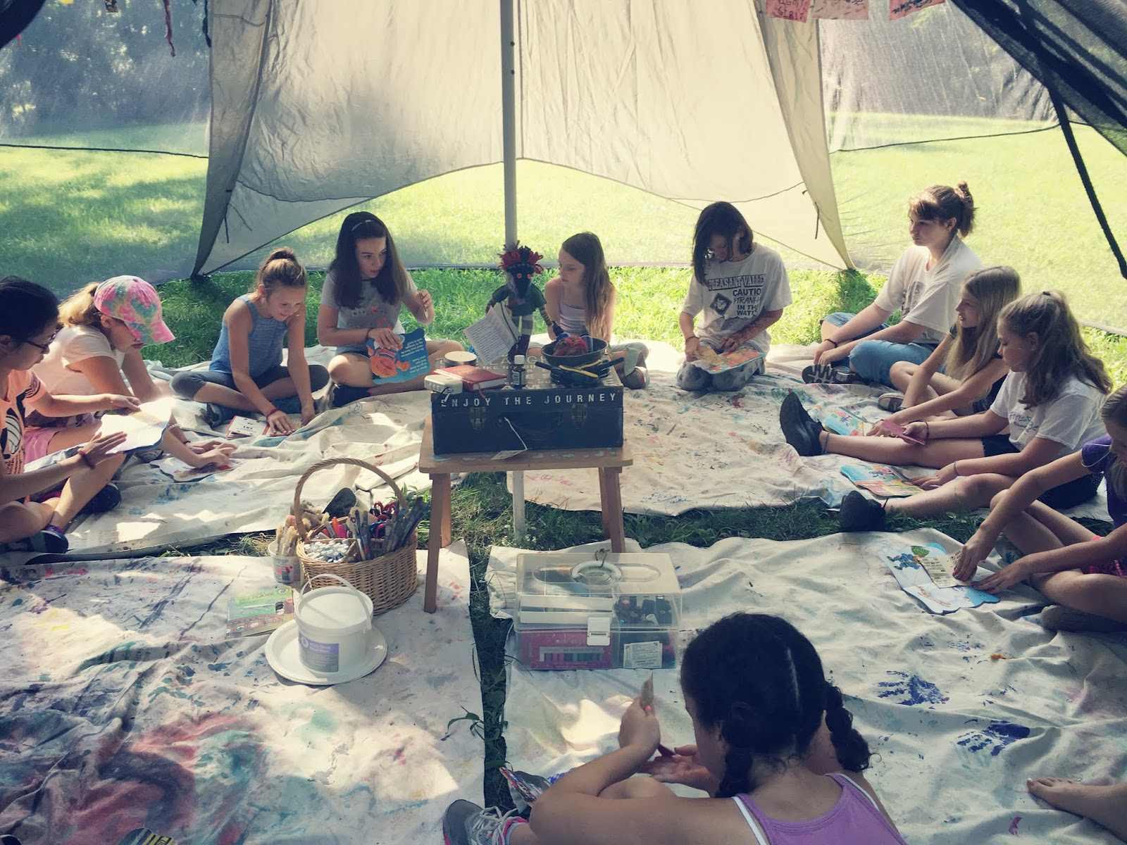 While the girls painted their walkng sticks, our magical Story Crow by Artist / Writer Ginnylee Snyder, stood sentinel at the entrance of the tipi, watching over the flock. While the walking sticks were drying in the sun, we cleaned up camp (leaving no trace) and hauled everything back to the studio.